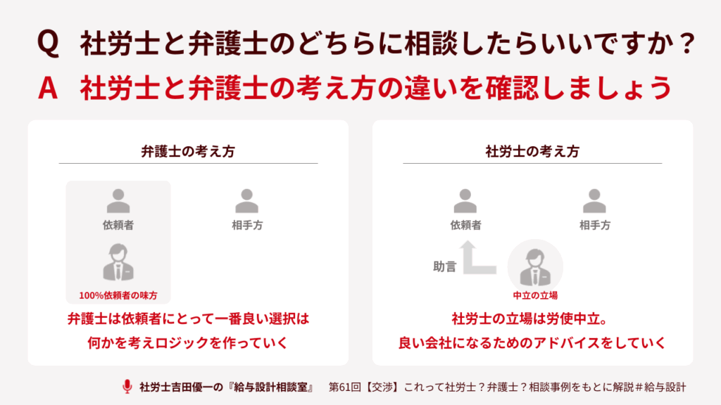 具体的な事例に入る前に、社労士と弁護士の立場と役割の違いについて整理しておくことが重要です。