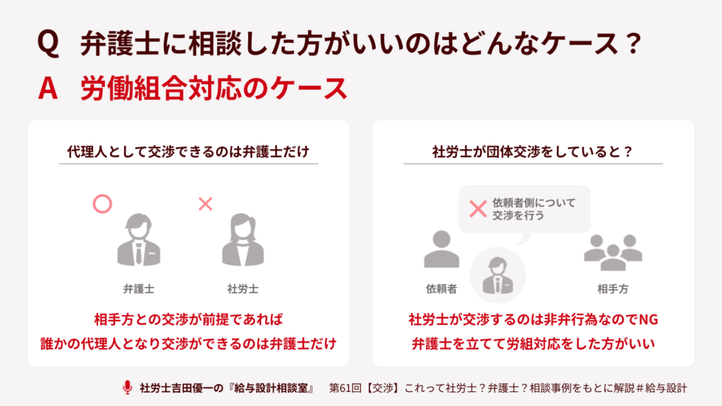 社労士が団体交渉の場で会社の代理人として発言を重ねると、相手方の労働組合から「それは非弁行為(弁護士資格がない者が報酬を得る目的で法律事務を行うこと)ではないか」と指摘されるリスクがあります。
