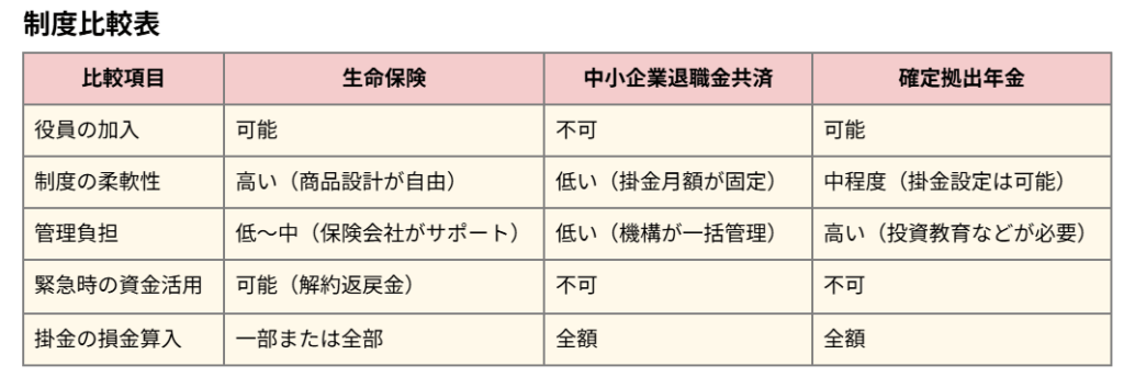 中小企業の退職金準備において、生命保険はどのような位置づけになるのでしょうか。代表的な制度との比較を見てみましょう。